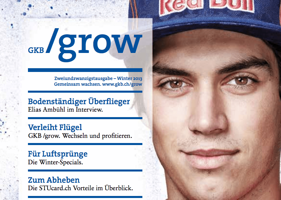 Von 2012 bis 2014 arbeitete ich als Texter bei der Designagentur /Department. Einer unserer Lieblingskunden war die Graubündner Kantonalbank. Weil ich angeblich geistig auf dem Niveau eines Fünfzehnjährigen hängen geblieben war, durfte ich jeweils die Texte für ihr Jugendmagazin schreiben. Hier ein Interview mit dem Freeskiass, Höhenflieger und Piloten Elias Ambühl.